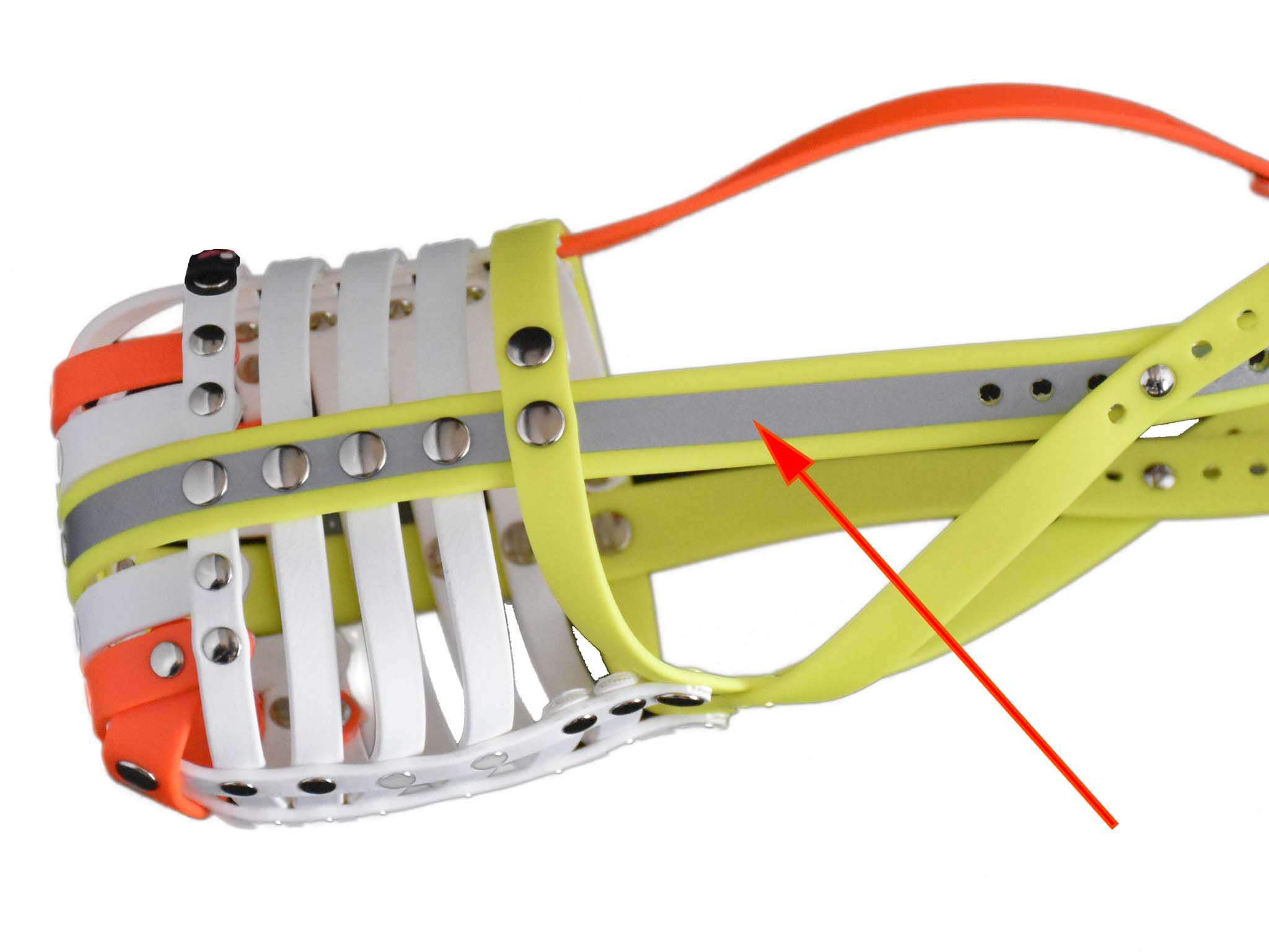 Der Hauptriemen am BUMAS Maulkorb wird durch eine reflektierende Version ersetzt. Für zusätzliche Sicherheit im Dunklen. Auch unsere Leinen und Halsbänder sind in dieser Ausführung möglich.